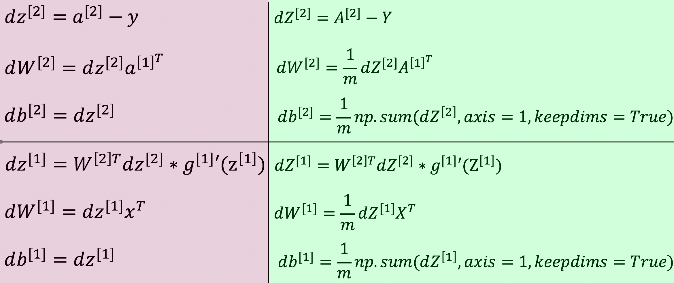 图中,棕色色块覆盖的部分表示单个样本的后向传播计算过程;绿色色块覆盖的是所有样本的堆叠在一起之后的后向传播向量化计算过程,也就是python实现后向传播过程所参照的计算公式。